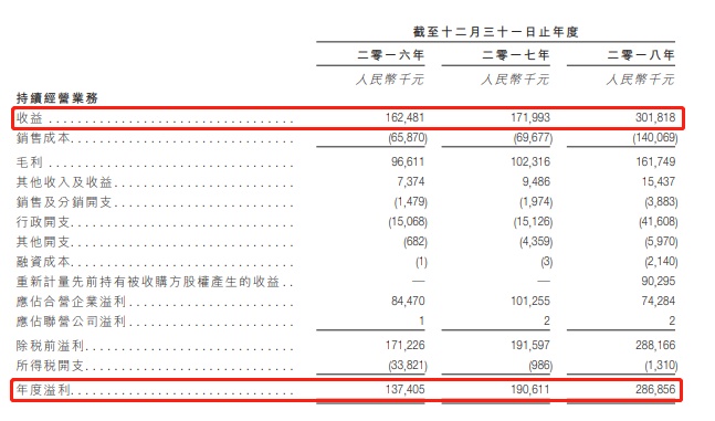 招股书更新了2018年的全年业绩,2016-2018年,嘉宏教育实现营业收入分别为1.62亿元、1.72亿元和3.02亿元,年度溢利分别为1.37亿元、1.91亿元和2.86亿元。从过往的盈利来看,嘉宏教育的营收及净利润于2018年实现了爆发式的增长,主因信息商务学院于2018年7月并表。