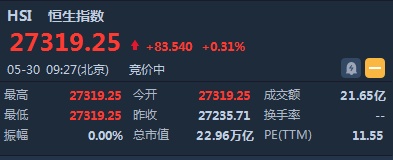 智通财经APP获悉,恒生指数开盘涨83.54点或0.31%,报27319.25点。国企指数涨0.58%,报10451点。红筹指数涨0.5%,报4299.94点。大市盘前成交21.65亿港元。隔夜美股三大指数集体收跌,道指收跌逾220点,创逾三个月以来新低,盘中一度跌超400点。