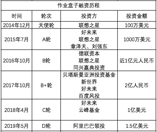 此前,作业盒子已经完成过5轮融资,投资方包括联想(00992)之星、好未来教育集团(TAL.US)、百度(BIDU.US)风投、云峰基金、贝塔斯曼亚洲投资基金等。