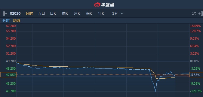 Capital狙击,尾盘上演“V型走势”。截至15时32分,跌5.33%,报价47.05港元,成交额6.953亿。