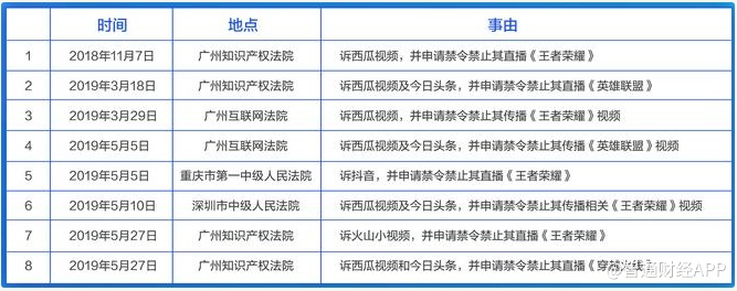 这8项诉讼分别涉及《王者荣耀》、《穿越火线》、《英雄联盟》三款游戏。同时,腾讯对所有案件均申请禁令,要求上述产品立即停止以直播/视频方式传播腾讯旗下游戏内容。