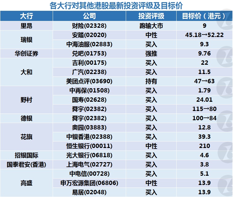 二、各大行对其他港股最新投资评级及目标价: