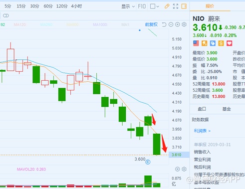 智通财经APP观察到,28日美股盘前蔚来汽车发布了2019年一季度业绩,因业绩超预期,随后高开曾一度涨逾7个点,但是该趋势并没有持续多久,便开始回落,截止收盘报4美元,上涨3.6%。29日更是低开低走,跌去近10个点,报3.61美元。