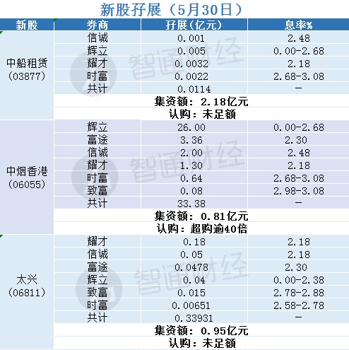 智通财经APP获悉,中船租赁(03877)、中烟香港(06055)、太兴(06811)、东方教育(00667)、嘉涛(02189)正在招股中,截至5月30日,辉立、耀才、时富、信诚等分别为其借出0.0114亿、33.38亿、0.33931亿、0.01334亿及0.046亿。其中,中船租赁、太兴、东方教育、嘉涛孖展未足额,中烟香港超购逾40倍。