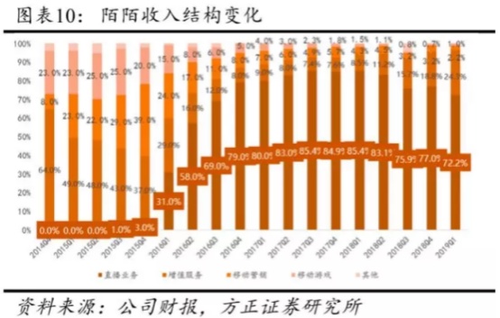 从收入结构来看,公司目前最主要的直播业务收入26.89亿元,同比增长13.95%;增值业务收入同比大增284.61%至9.04亿元。移动营销与游戏两项业务收入出现下滑,同比分别下降32.08%、7.63%。