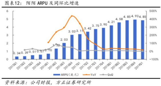 其中,增值服务成为陌陌新的收入增长点。截止19年一季度,增值服务收入对总营收的贡献达到24%。陌陌根据用户的位置、兴趣等为用户提供了秀场、短视频、社交游戏、现场聊天和线上卡拉OK等互动情景。