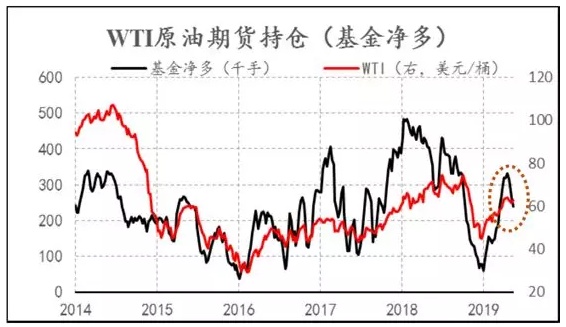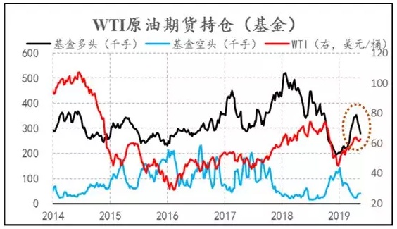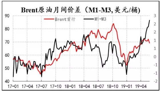 但这并不一定说明减产协议一定是无效的。可以看一些指标,比如月间价差,月间价差意思是最近合约价格减去远月合约价格。19年1月减产以来,油价上涨,Brent原油价差走高,这说明市场依然认为减产协议是有效的,可以很好地收紧原油市场的供应。反观WTI,表现得就很弱势,不管油价下跌还是波动,它的月间价差依然保持低位,也就是说美国的原油市场是一个偏弱的市场。