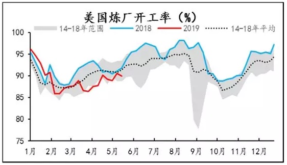 美国原油产量增加、出口下滑,意味着供给当地的总量是增加的。在这样的情况下,当地的炼厂能否把增加的产量消化掉,可以看一下图十,美国炼厂的开工率。从1月份开始,炼厂开工率持续下滑,最近几个月一直保持低位运行,也就是说美国的炼厂并没有很好地去消化掉它所生产的这些原油。主要原因是3月份-5月份期间一般是美国的春季检修。今年为了应对IMO2020低硫政策,炼厂增加装置改造规模,导致与往年相比开工率更低、检修期偏长。