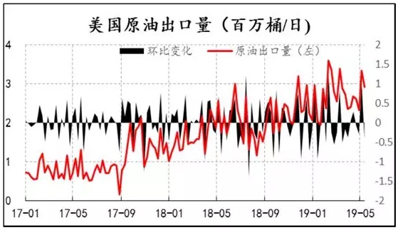如图九,从2月份开始到5月份,美国原油出口量出现下滑,有两个原因,一是美国南部区域的港口发生了航道的撞船事件导致航道暂时封锁,导致当地出口受影响;二是当时经贸摩擦升级后,中国从美国采购的原油量有所下滑。