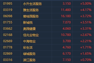 智通财经APP获悉,恒指午后跌幅进一步扩大,失守两万七关口,物业管理板块逆势走强,截至发稿,永升生活服务(01995)涨5%,雅生活服务(03319)涨4.17%,碧桂园服务(06098)、新城悦(01755)、奥园健康(03662)涨超3%。