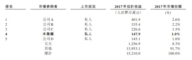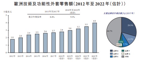 据Frost&Sullivan报告,按收益计该公司为2017年中国四大技术及功能性外套制造商,市场份额约为1.0%。于往绩记录期,OEM客户主要为欧洲、中国及美国经营国际外套及运动服饰品牌(例如Swix及Gore GmbH)的公司。