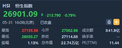 截至收盘,恒生指数跌213.79点或0.79%,报26901.09点,全日成交额达841.97亿。国企指数跌0.6%,报10387.17点,红筹指数跌0.22%,报4285.86点。