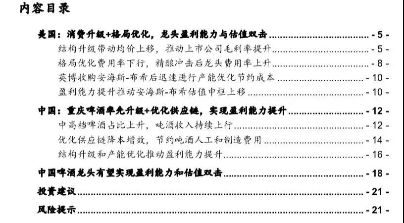 核心观点:2018年12月以来我们持续发布多篇报告推荐啤酒板块,强调行业竞争格局从价格战转向结构升级,应积极关注ASP提升。同时行业内企业积极优化产能、提高产能利用率、降本增效。此外,期待未来格局优化后费用率进入下行周期。本文从对比视角出发,借鉴美国啤酒龙头安海斯-布希及中国啤酒先行指标重庆啤酒的经验,我们认为中国啤酒龙头华润啤酒(00291)和青岛啤酒(00168)将演绎戴维斯双击。