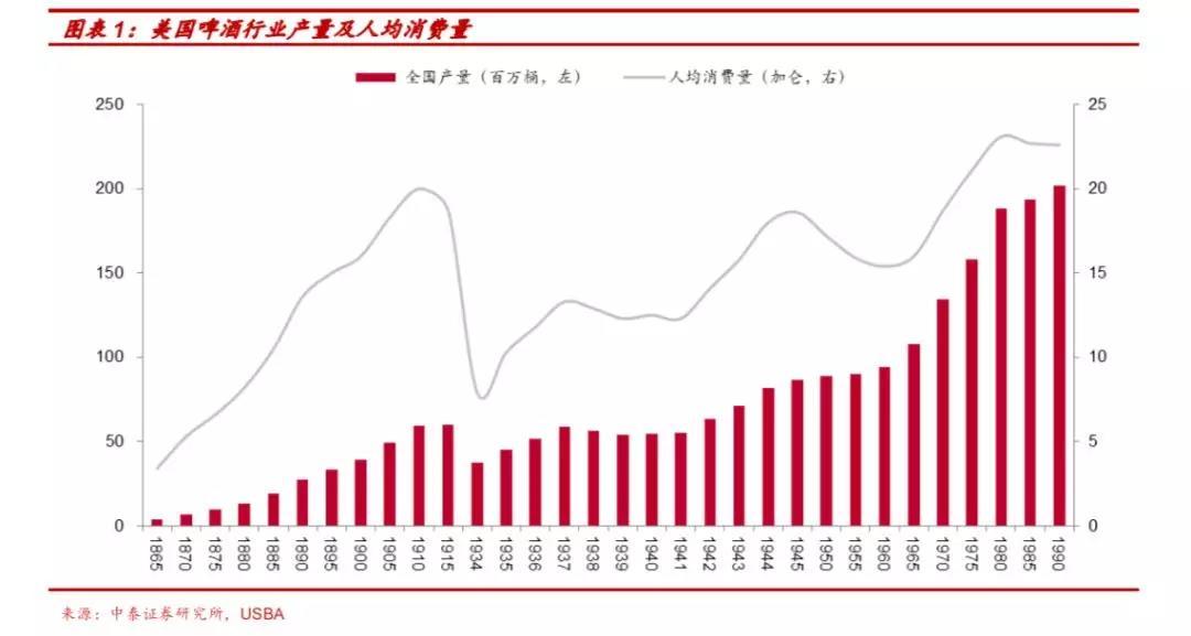 从产销量看,美国啤酒行业的发展可分为五个阶段,消费升级出现在人均消费量下滑或趋于饱和时。