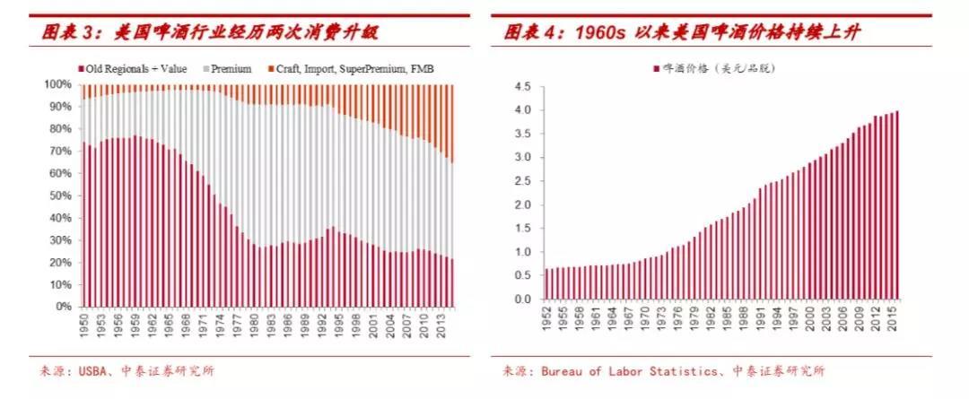 1960s美国啤酒开启消费升级,价格保持3%左右的CAGR。1960s以前,美国啤酒行业主要以中低端产品为主,占据了75%左右的市场份额,1952-1960年美国啤酒价格的CAGR仅1.1%。1960-1980年美国啤酒 行业开始向高端产品升级,高端酒的市场份额从20.2%快速提升至62.9%,期间美国啤酒价格的CAGR达到3.5%。1980年至今美国啤酒开启第二轮消费升级,精酿、进口、超高端啤酒迅速发展,占比从8.7%提升至35.1%,带动1980-2016年啤酒价格保持2.9%的CAGR。