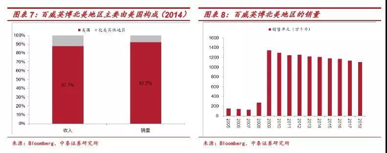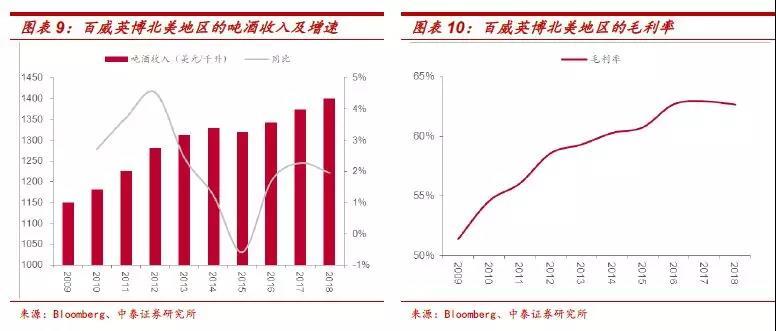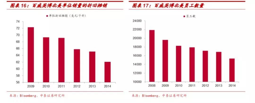 (3)英博收购安海斯-布希后迅速进行产能优化节约成本。2009-2014年百威英博北美单位销量的折旧摊销从72.3下降至62.1美元/千升。2008年北美员工数为21871人,2014年下降至15348人。