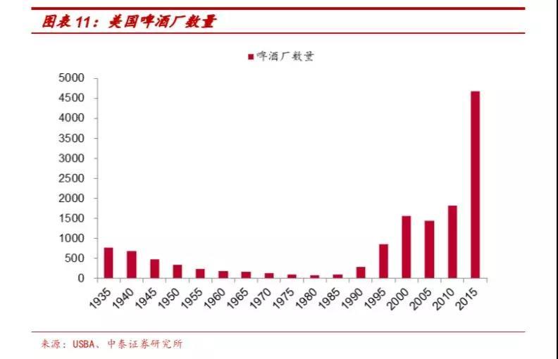 从美国啤酒厂数量看,可分为传统大厂集中度提升和精酿小厂快速扩张两个阶段。禁酒令废除后,1935-1980年美国啤酒厂数量从766家下降到92家,传统的啤酒工厂随行业向成熟发展,集中度不断提升。1980年后精酿啤酒出现,小型的精酿啤酒厂快速扩张,带动行业的工厂数量 从1980年的92家增长至2015年的4672家。尤其是2010年后精酿啤酒发展迅速,2018年美国啤酒厂数量为7450家,是2010年的4倍。
