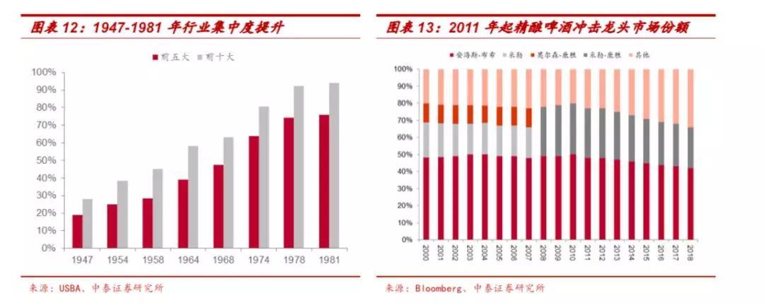 2000年前,美国啤酒行业处于集中度提升阶段,龙头在高市占率的情况下份额继续提升,格局持续优化。1947-1981年,美国前五大啤酒厂 的市场份额从19%提升至 75.9%,前十大的份额从28.2%提升至93.9%。 至2000年前三大安海斯-布希、米勒、莫尔森-康胜已占据约80%的份额,其中安海斯-布希一家的市占率接近50%。