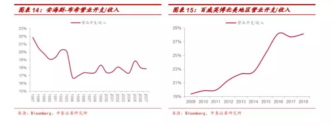 行业格局优化阶段龙头费用率下行,精酿冲击后龙头费用率上升。由于未披露销售费用数据,我们以营业开支(营业利润-毛利)来衡量费用的投放力度。1987-1994年,随行业集中度提升,安海斯-布希龙头地位持 续加固,格局向好营业开支/收入保持下降趋势,从21.9%下降16.8%。1995-2010年市场份额保持稳定,因此龙头营业开支/收入也保持稳定。1995-2007年安海斯-布希的营业开支/收入在18%左右,2009-2011年百威英博北美地区的营业开支/收入在19%-20%。2012年开始由于精酿啤酒对传统工业啤酒的冲击,龙头市场份额出现下滑,营业开支/收入从20%左右提升至2018年的28%。