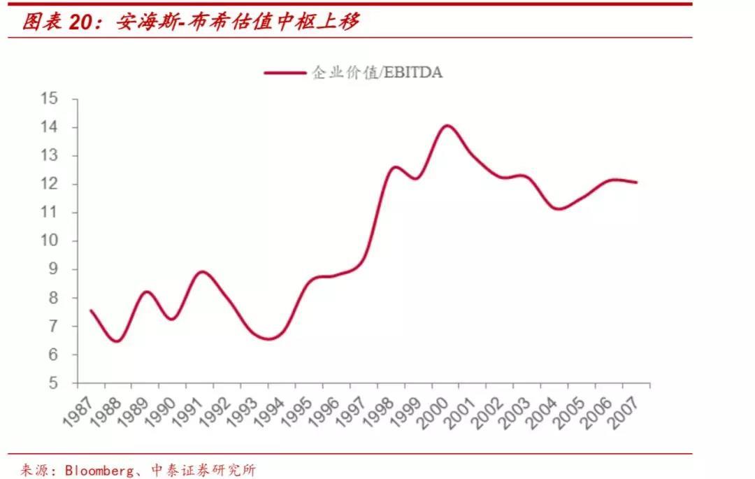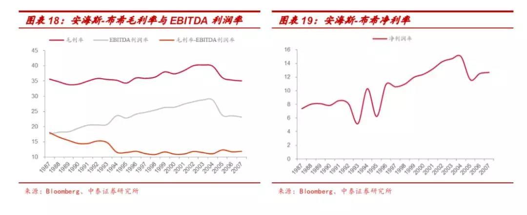 (4)盈利能力提升推动安海斯-布希估值中枢上移。1987-2004年安海 斯-布希的EBITDA利润率从17.6%提升至28.8%,净利率从7.4%提升至15.0%,EV/EBITDA从7倍上升至12倍。