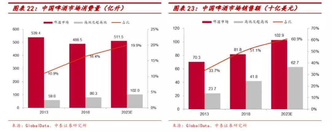 从销售额看,2013-2018年我国啤酒销售额从70.3上升到81.8十亿美元,CAGR为3.1%;高端及超高端销售额从23.7上升至41.8十亿美元,CAGR为12.0%;高端及超高端销售额占比从33.7%提升至51.5%。预 计2018-2023年啤酒销售额从81.8上升到102.9十亿美元,CAGR为4.7%;高端及超高端销售额从41.8上升至62.7十亿美元,CAGR为8.5%;高端及超高端销售额占比从51.1%提升至60.9%。