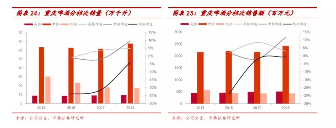 重庆啤酒率先开始结构升级,中档及高档增长更快。2013年嘉士伯入主重啤后开始大力推动产品结构升级,发力中档和高档,削减低档产品。 公司产品按照零售价区间分为三个档次:高档(8元人民币以上),中档(4-8元人民币),低档(4元人民币以下)。2015-2018年公司高档产品销量从8.8上升至9.4万千升,CAGR为2.5%;中档产品销量从63.4上升至67.4万千升,CAGR为2.1%;低档产品销量从30.6下降至17.6万千升,CAGR为-16.9%。从收入看,2015-2018年高档产品收入从4.5亿增长到5.1亿元人民币,CAGR为4.4%;中档收入从21.6亿增长到24.1亿元人民币,CAGR为3.8%; 低档收入从5.8亿下降到4.3亿元人民币,CAGR为-9.6%。