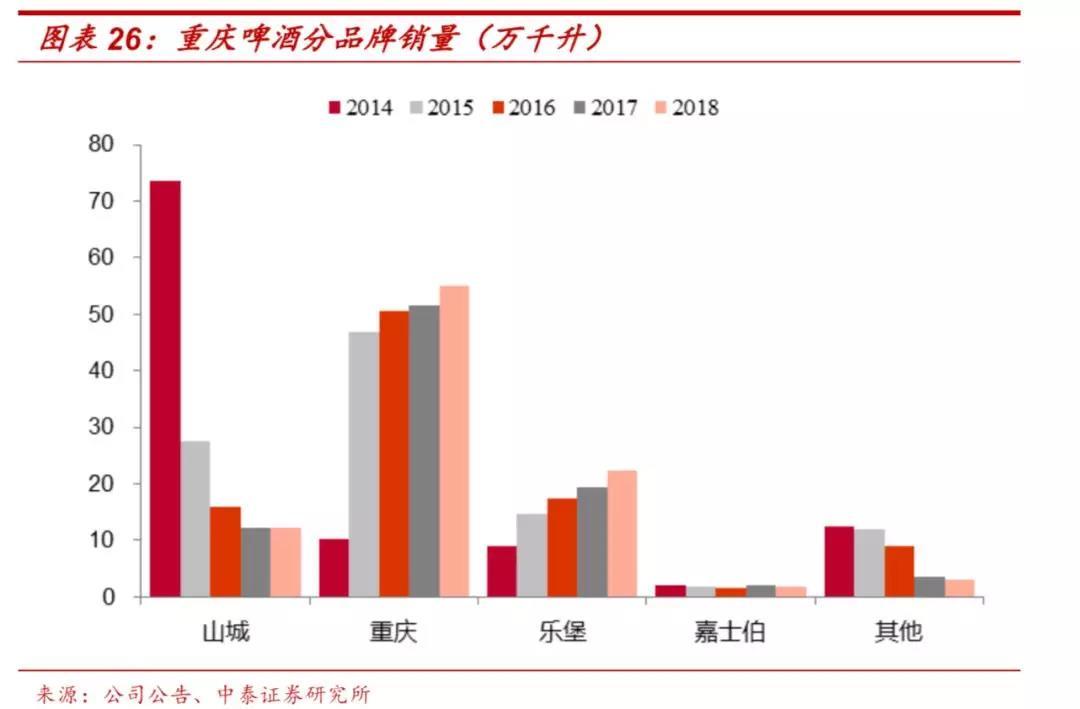 重庆和乐堡作为中高档品牌快速增长,低档山城品牌下滑。山城(主要定位4元人民币)作为公司低档品牌,销量从2014年的74万吨下降到2015年的28万吨,此后仍逐年收缩,2018年销量仅12万吨。重庆(主要定位6元人民币)和乐堡(主要定位8元人民币)是公司的中高档品牌,销量保持上升,尤其是2015年公司用重庆品牌大规模替换了山城品牌开启了第一轮从4元到6元人民币的消费升级。2019年公司推出国宾醇麦新品,并加大对乐堡和嘉士伯的推广,开始将主流价格带从6元向8元人民币升级。