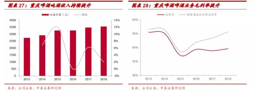 结构升级推动重庆啤酒吨酒收入和啤酒业务毛利率提升。重庆啤酒吨酒收入从2013年的2731元人民币/千升提升至2018年的3544元人民币/千升,CAGR为5.4%。2013-2018年重庆啤酒的委托加工量从2万千升增长到15万千升,由于委托加工采用成本加成法,拉低了啤酒业务毛利率。我们以 成本加成率11%进行估算,剔除委托加工后啤酒业务的毛利率从2015年的39%上升至2018年的46%。2015年毛利率大幅下降主要系公司将归属于供应链的费用从管理费用转入成本核算。