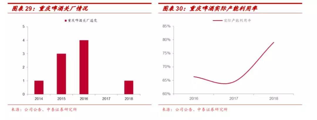 重庆啤酒率先关厂,产能利用率提升。重庆啤酒于2014年先于行业进行关厂优化产能,2014、2015、2016年分别关闭了1、3、4家工厂,2018年底再关闭一家,工厂数从23家减少到14家,关闭的主要是落后且规模偏小的产能。2016-2017年公司实际产能利用率保持在65%左右,2018年进一步上升至79%。