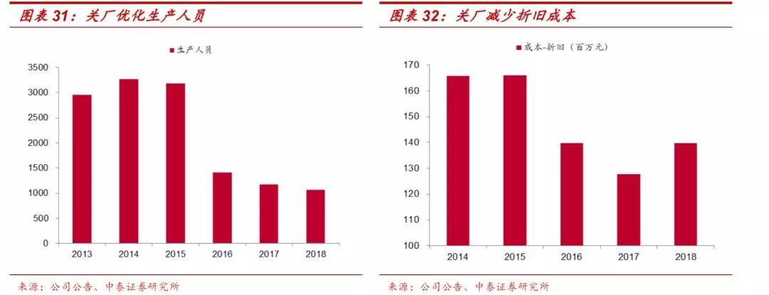 关厂节约了人员成本和折旧。受益于关厂优化产能,重庆啤酒生产人员从2014年的3272人减少到2018年的1068人,尤其是2016年生产人员减少超过50%。同时过剩产能的关闭也节约了折旧,重庆啤酒生产成本中的折旧从2014年的166百万元人民币下降至2017年的128百万元人民币 。