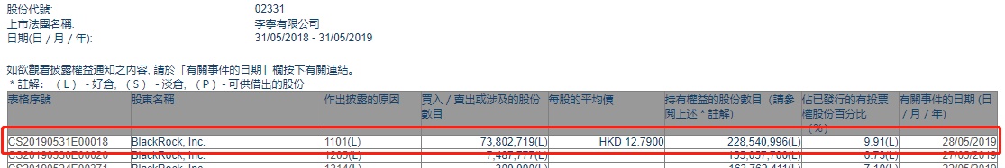 智通财经APP获悉,根据联交所资料显示,贝莱德(BLK.US)于5月28日增持李宁(02331)7380万股,每股作价12.79港元,总值约9.44亿港元,最新持股数目约2.28亿股,最新持股比例为9.91%。