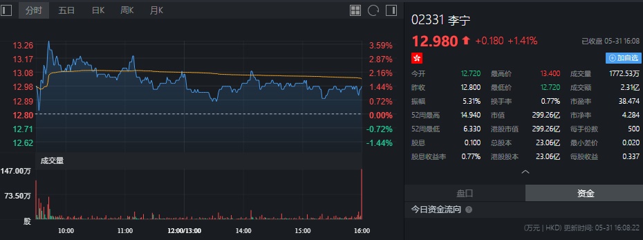 截至今日收盘,李宁(02331)涨1.41%,报12.98港元。