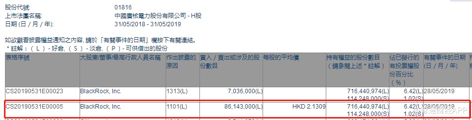 智通财经APP获悉,根据联交所资料显示,贝莱德于5月28日增持中广核电力(01816)8614.3万股,每股作价2.13港元,总值约1.83亿港元,最新持股数目约7.16亿股,最新持股比例为6.42%。