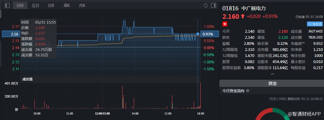 截至今日收盘,中广核电力(01816)涨0.93%,报2.16港元。