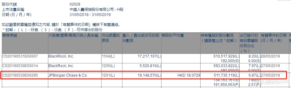 智通财经APP获悉,根据联交所资料显示,摩根大通于5月27日减持中国人寿(02628)1915万股,每股作价18.07港元,总值约3.46亿港元,最新持股数目约5.12亿股,最新持股比例为6.87%。