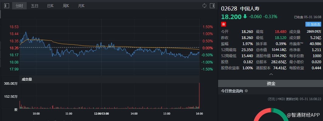 截至今日收盘,中国人寿(02628)跌0.33%,报18.20港元。