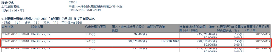 智通财经APP获悉,根据联交所资料显示,贝莱德(BLK.US)于5月28日减持中国太保(02601)2987万股,每股作价28.17港元,总值约8.41亿港元,最新持股数目约2.2亿股,最新持股比例为7.95%。