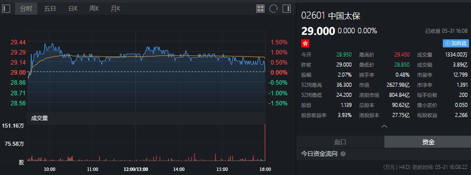 截至今日收盘,中国太保(02601)报29.00港元,与上一交易日相同。