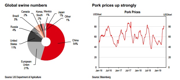 本就需要进口的猪肉,因为2018年9月爆发的非洲猪瘟,生猪存栏量下降的非常快。截至4月底最新的数据,存栏量相比于去年同期下滑20.8%。而且目前仍然没有看到停止下降的趋势。