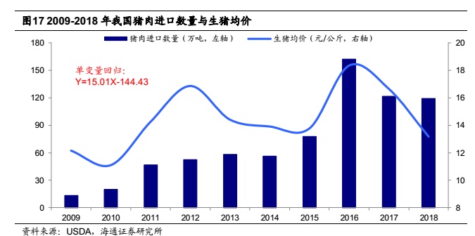 短缺已经非常确定了,根据海通的测算,生猪价格每上升1元/公斤,猪肉进口的增量大约在15万吨左右。近期美国进口的生猪量不断的攀升,因为美国的猪肉价格还是相对便宜的,中国/美国的猪肉价格是美国的1.86倍。但是海外的猪肉是明显不够国内使用的。