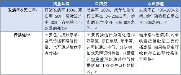 值得对比的是之前的高致病性猪蓝耳病和口蹄疫,简单对比一下,发现虽然非洲猪瘟的传播方式相对来说没有口蹄疫和猪蓝耳病一样通过空气就可以传播,但是死亡率却远远高于前两者。而且我国的南猪北养也让非洲猪瘟的传播非常猛烈。