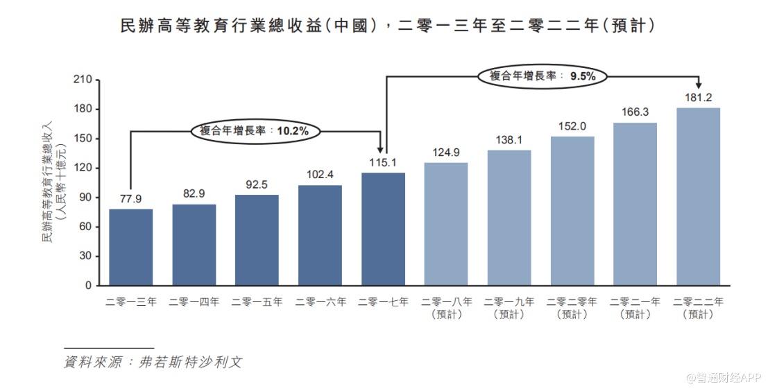 嘉宏教育招股书显示,中国民办高等教育行业2013年至2017年总收入复合年增长率为10.2%,预计2017年至2022年预计将由1151亿元增至1812亿元,复合年增长率为9.5%。该增长主要由学费、住宿费及其他杂费推动。