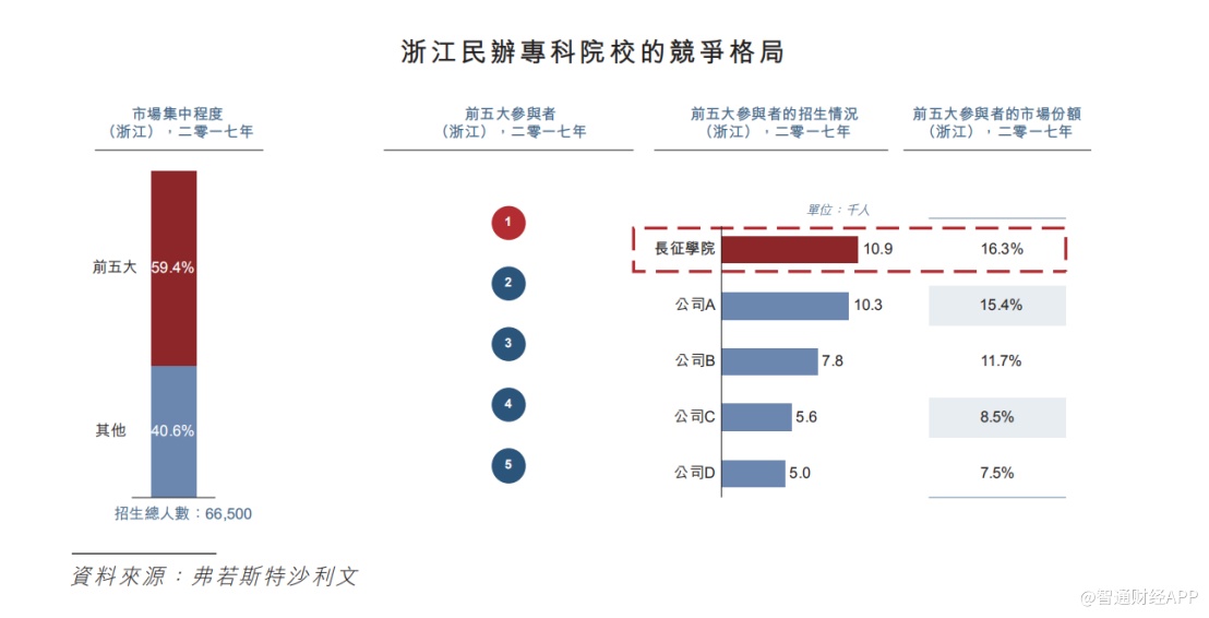 此外,浙江高等教育市场竞争格局趋于集中,以招生人数计算,2017年市场前五大教育机构市占率为22.7%,其中,专科院校2017年前五大教育机构市占率59.4%。嘉宏旗下长征学院排名第四,占比3.5%。在专科院校细分领域,长征学院排名第一,占比16.3%。
