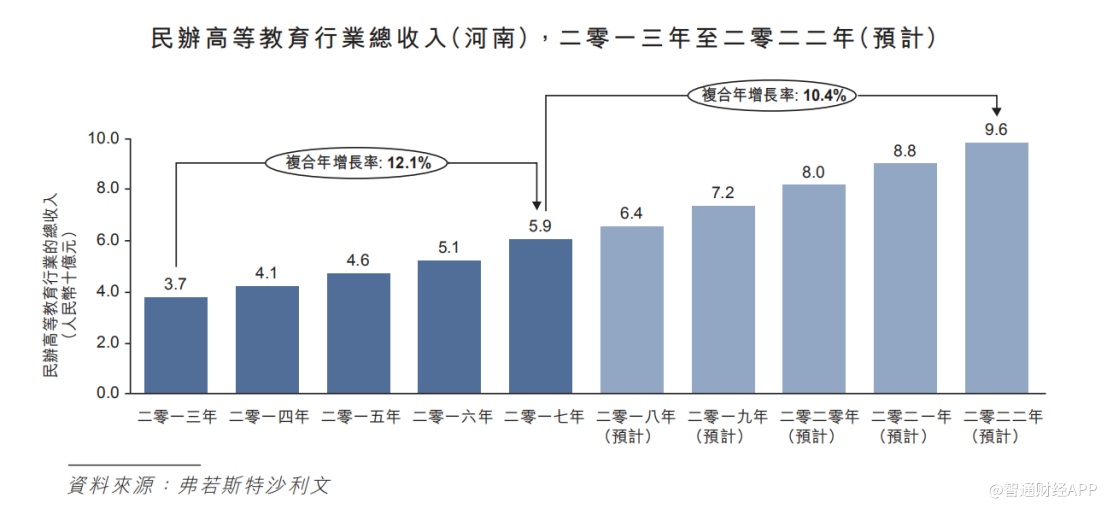 河南省民办高校市场收入规模2013年至2017年年均复合增长率为12.1%,预计2017年至2022年将亿10.4%的增速增长至9.6亿元。
