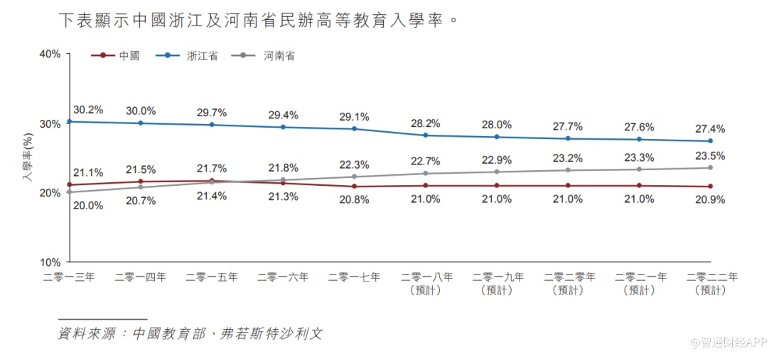 细分来看,嘉宏教育所在的浙江及河南两省,民办教育的发展都有着不错的预期。其中,浙江省2017年至2022年民办高等教育总收入将以9.2%的年均复合增长率增长。