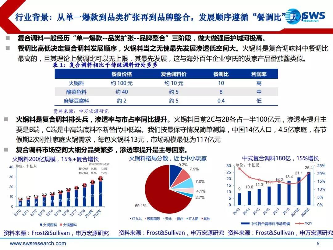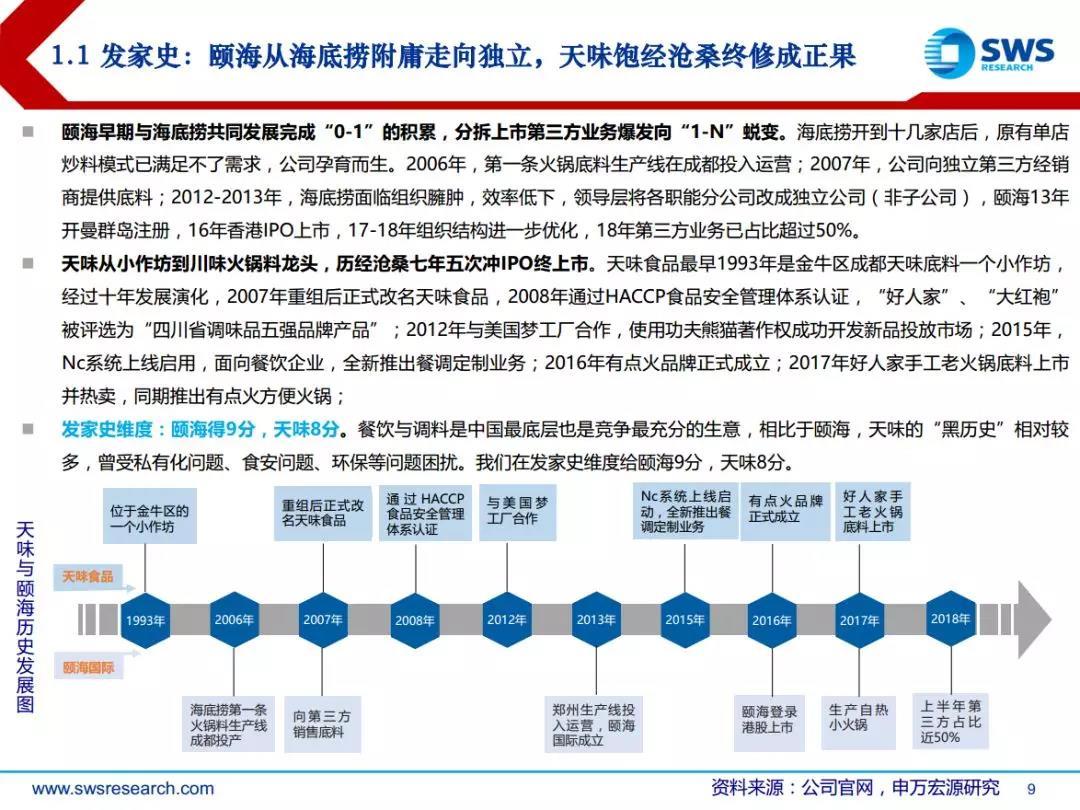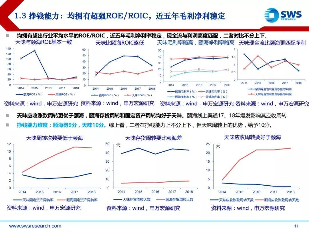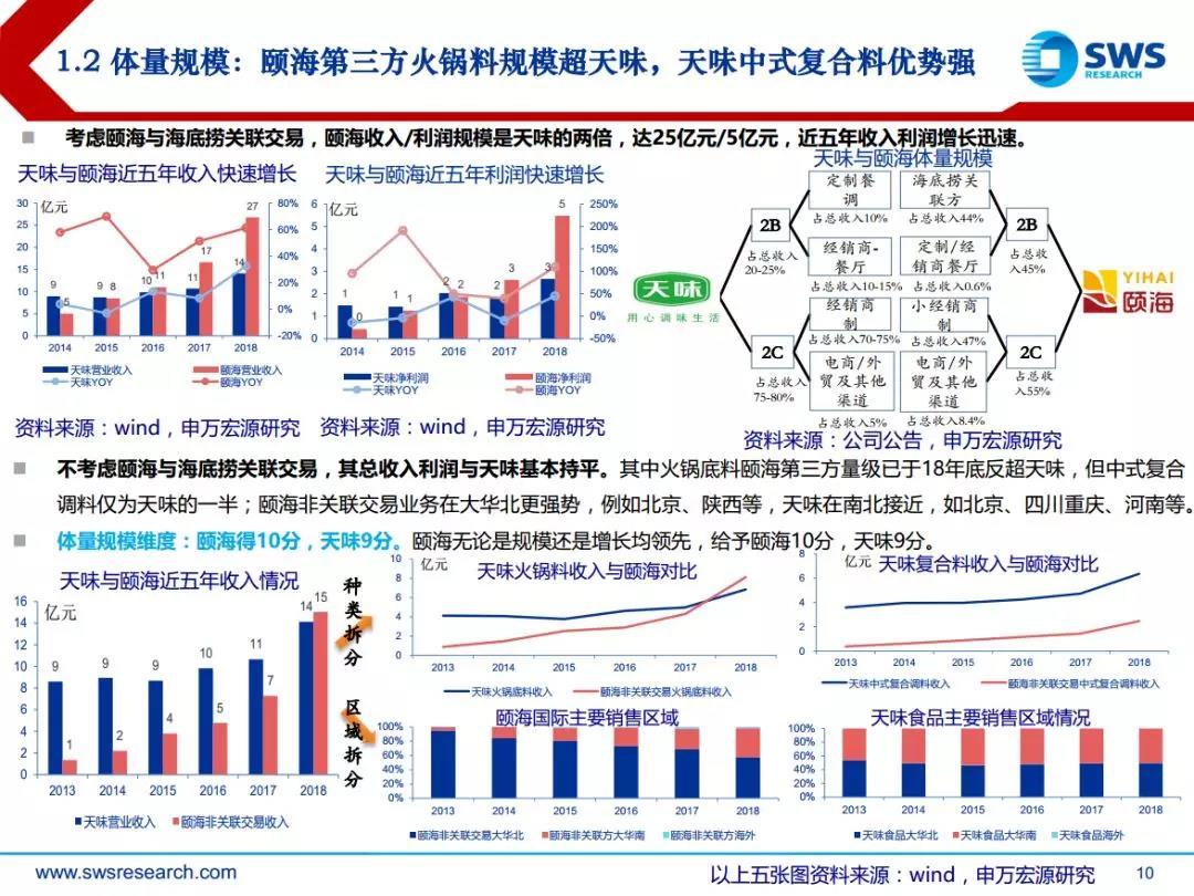 完成蜕变脱颖而出,天味颐海历史成绩斐然。1)发家史:颐海早期与海底捞共同发展完成“0-1”的积累,分拆上市第三方业务爆发向“1-N”蜕变;天味从小作坊到川味火锅料龙头,历经沧桑七年五次冲IPO终上市;二者均常年排名行业前三;2)体量规模:考虑颐海与海底捞关联交易,其收入/利润规模是天味的两倍为27/5亿元;不考虑颐海关联交易,其总收入利润与天味基本持平,其中火锅底料颐海已于18年底反超天味,但中式复合调料仅为天味的一半,颐海在大华北区更强势,天味在南北区接近。3)挣钱能力:均拥有超强ROE/ROIC和现金流,天味应收周转好于颐海,颐海存货周转和固定资产周转好于天味。