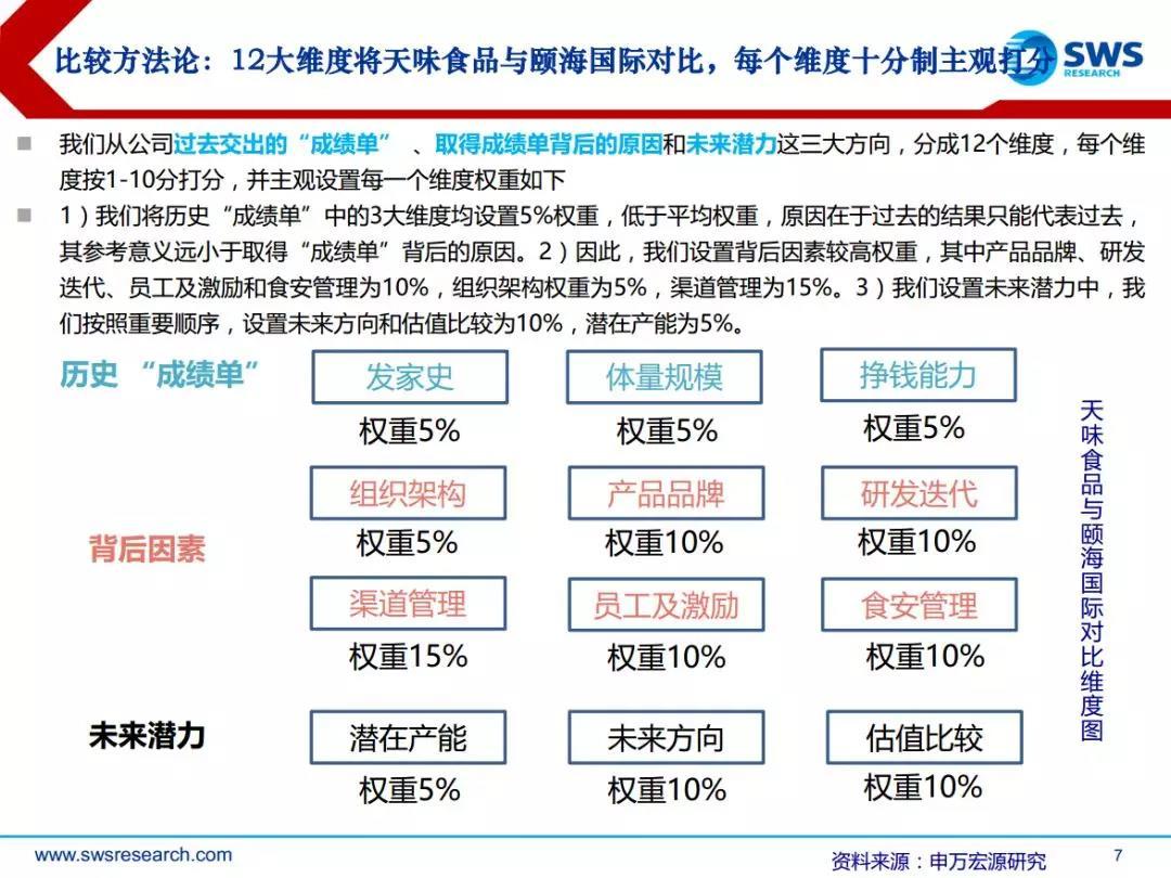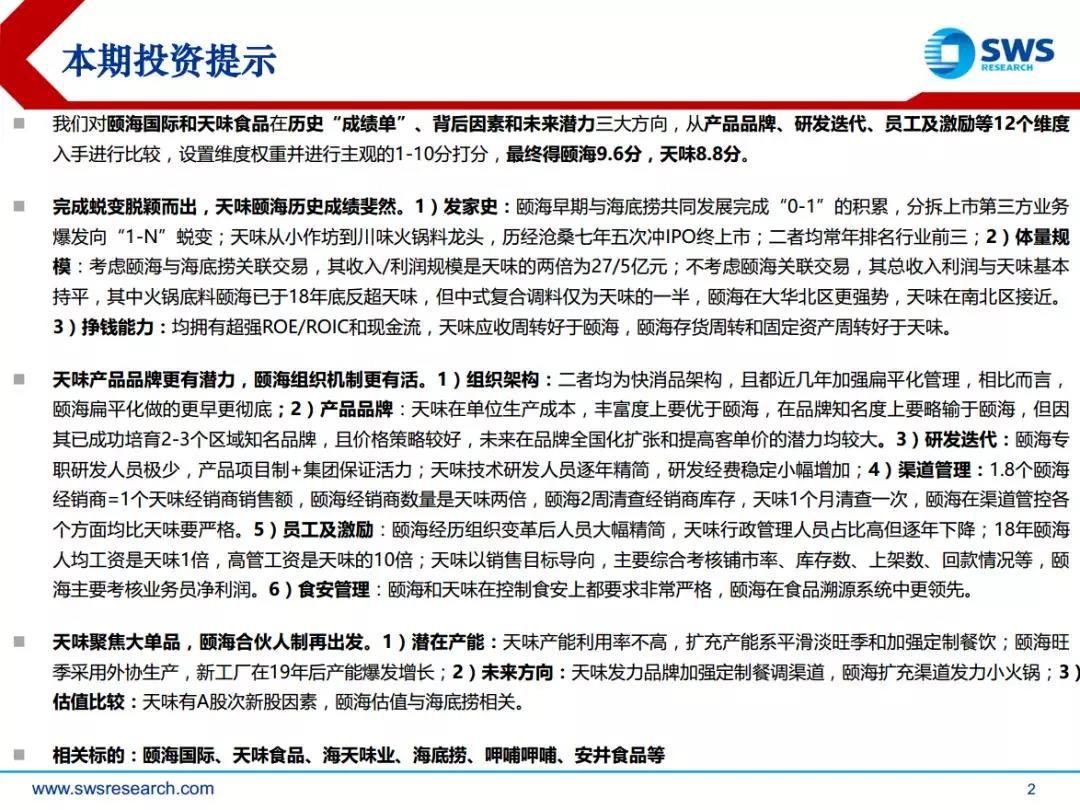 我们对颐海国际(01579)和天味食品在历史“成绩单”、背后因素和未来潜力三大方向,从产品品牌、研发迭代、员工及激励等12个维度入手进行比较,设置维度权重并进行主观的1-10分打分,最终得颐海9.6分,天味8.8分。
