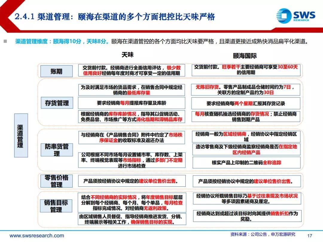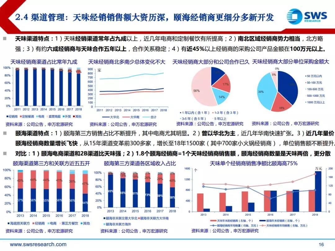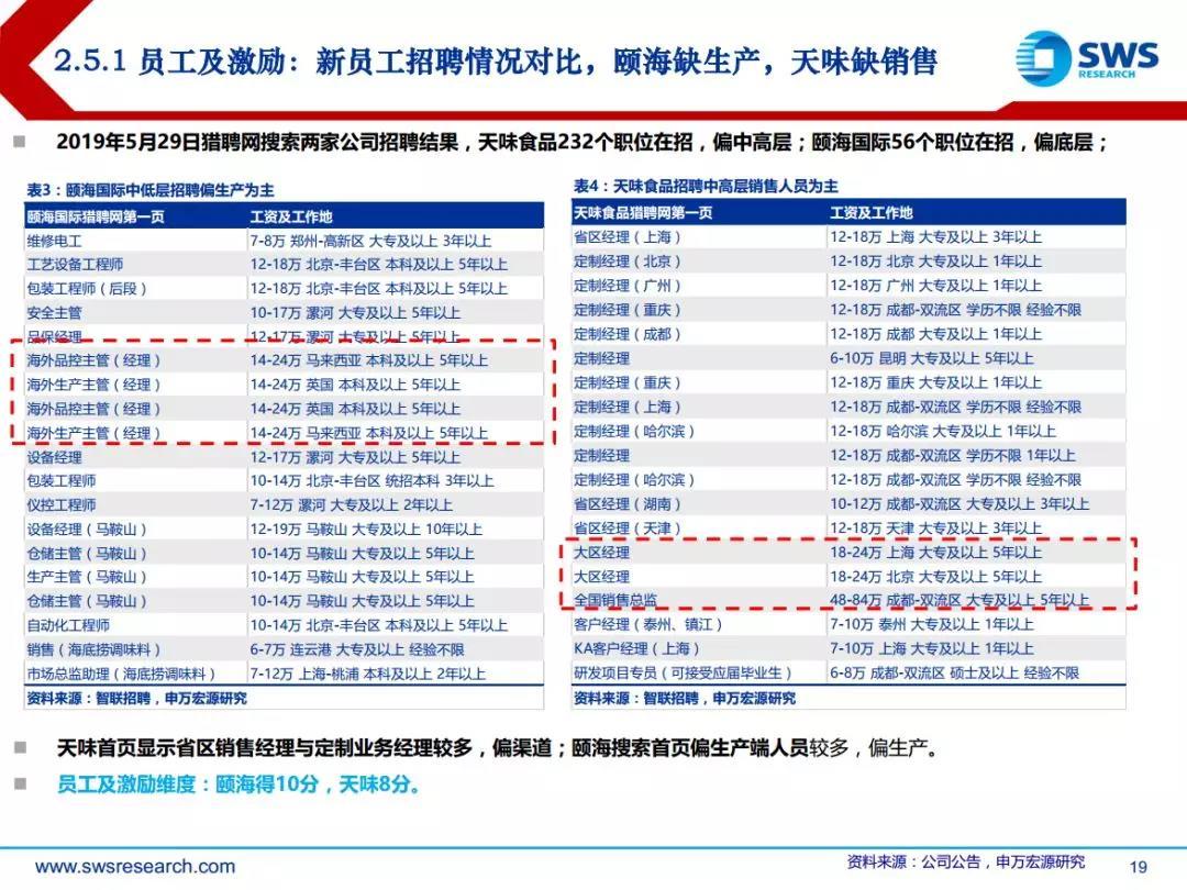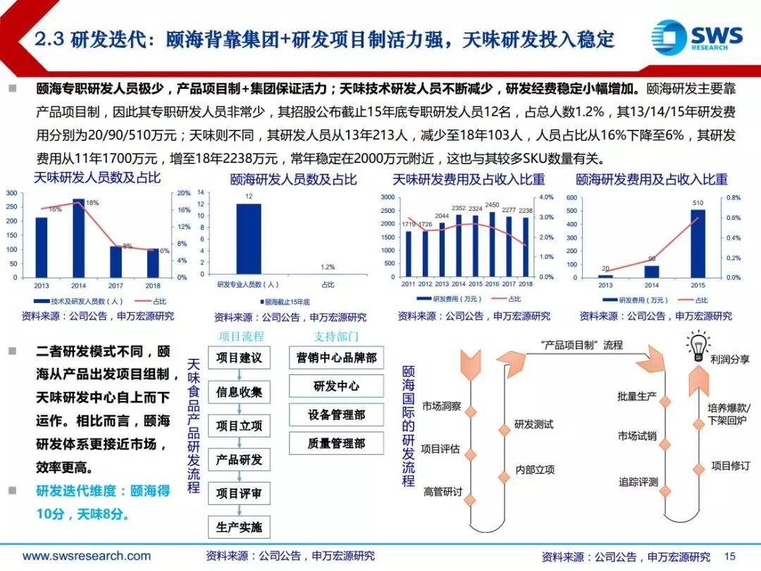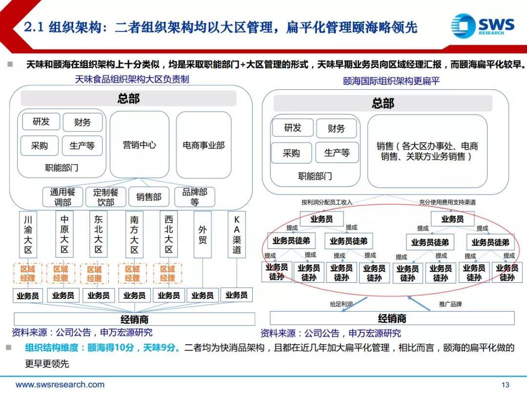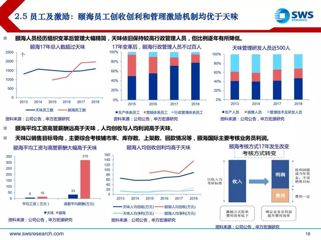 天味产品品牌更有潜力,颐海组织机制更有活。1)组织架构:二者均为快消品架构,且都近几年加强扁平化管理,相比而言,颐海扁平化做的更早更彻底;2)产品品牌:天味在单位生产成本,丰富度上要优于颐海,在品牌知名度上要略输于颐海,但因其已成功培育2-3个区域知名品牌,且价格策略较好,未来在品牌全国化扩张和提高客单价的潜力均较大。3)研发迭代:颐海专职研发人员极少,产品项目制+集团保证活力;天味技术研发人员逐年精简,研发经费稳定小幅增加;4)渠道管理:1.8个颐海经销商=1个天味经销商销售额,颐海经销商数量是天味两倍,颐海2周清查经销商库存,天味1个月清查一次,颐海在渠道管控各个方面均比天味要严格。5)员工及激励:颐海经历组织变革后人员大幅精简,天味行政管理人员占比高但逐年下降;18年颐海人均工资是天味1倍,高管工资是天味的10倍;天味以销售目标导向,主要综合考核铺市率、库存数、上架数、回款情况等,颐海主要考核业务员净利润。6)食安管理:颐海和天味在控制食安上都要求非常严格,颐海在食品溯源系统中更领先。