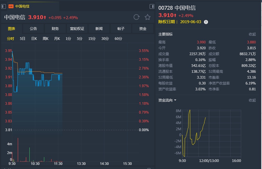 该行表示,内地延迟5G发展对内地电信商有利,首选中电信(00728),予其“增持”评级,目标价为4.6港元,因认为其股价比中国联通(00762)更具防御性,同时称中电信受惠网络优势和市场份额增长,财务前景良好,增长更胜中移动(00941)。