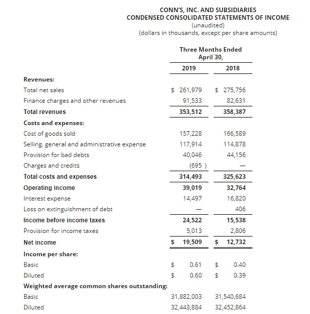 智通财经APP获悉,科恩公司(Conn’s Inc.) (CONN.US)于31日发布2020财年第一季度业绩报告。截至2019年4月30日止3个月,公司实现总营业收入3.53亿美元,较上一财年同期3.58亿美元减少1.4%;运营收入3901万美元,同比增长19.08%;净收入1950万美元,同比增加53.18%;零售同店总销售净额下降了8.2%;摊薄每股收益60美分,按非经常性收益调整后的盈利为每股58美分,高于分析师预期。